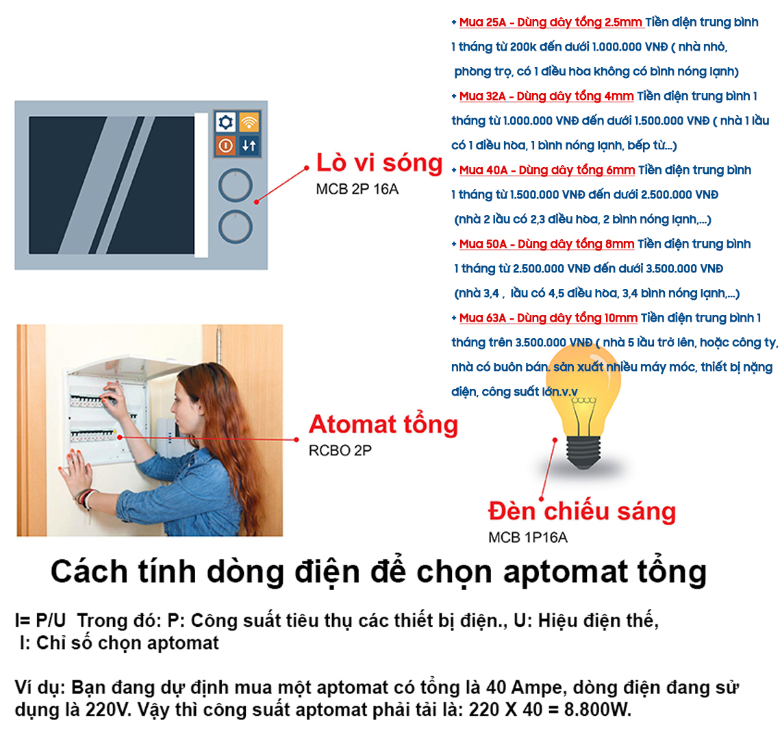 Chọn loại aptomat phù hợp với công suất thiết bị sử dụng và nguồn điện (1 pha hay 3 pha).